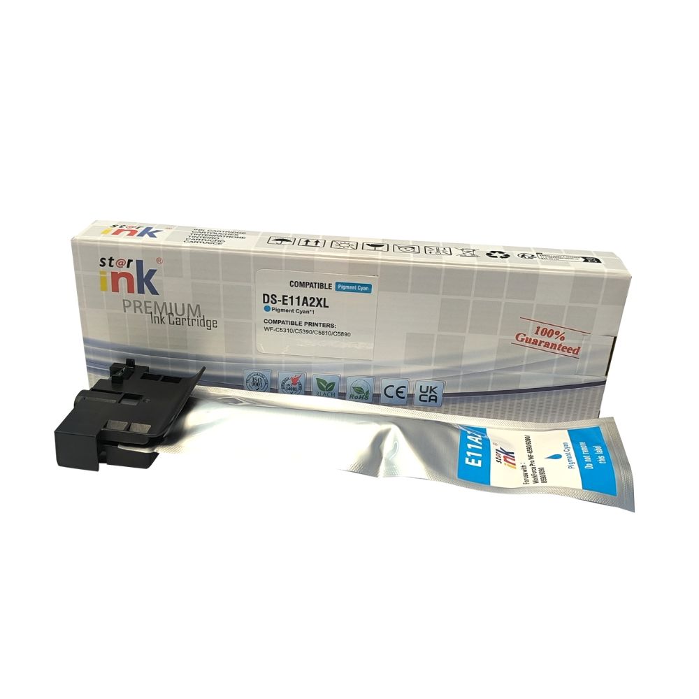 Cartucho bolsa de tinta pigmentada compatível Epson E11A2 XL, Ciano 70ml, com capacidade de rendimento para 5 mil páginas considerando 5% de cobertura no papel A4. Para uso nos seguintes equipamentos: Workforce Pro WF-C5310, WF-C5390, WF-C5810, WF-C5890.